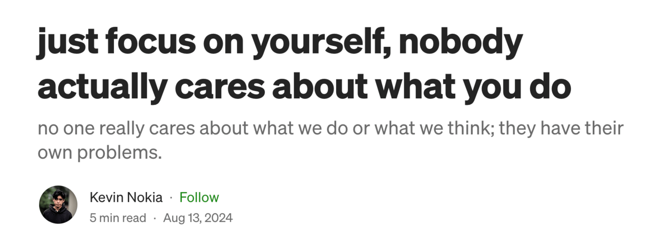 Very quick read about how seemingly everyone thinks that others are constantly judging them, when in reality everyone is too busy caring about their own problems. A good reminder to do what makes you happy and not give a f*ck about what other people think.